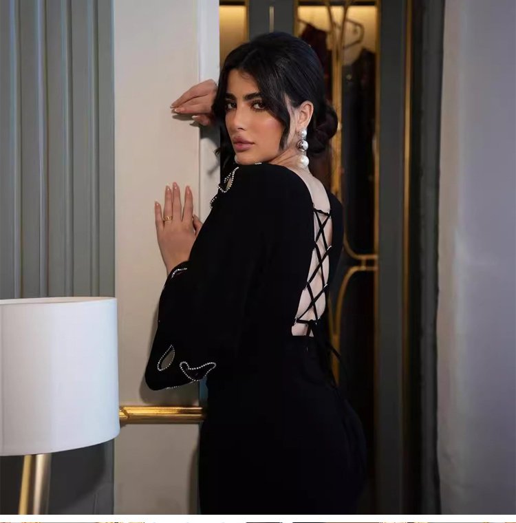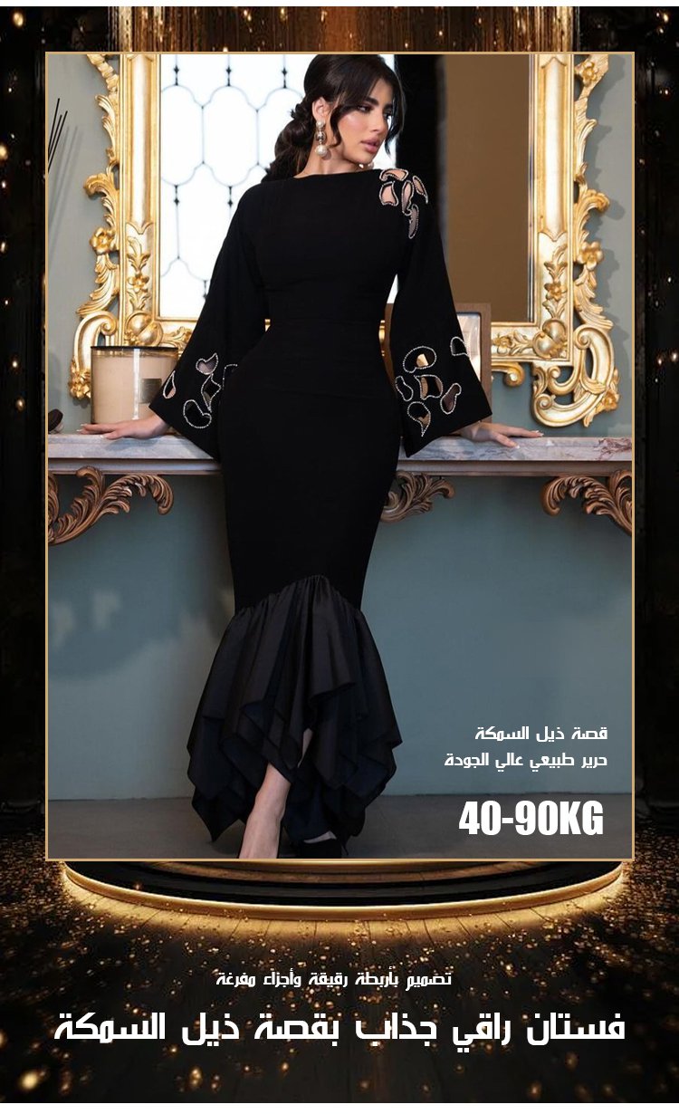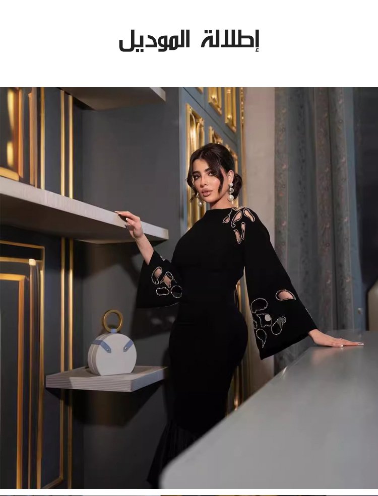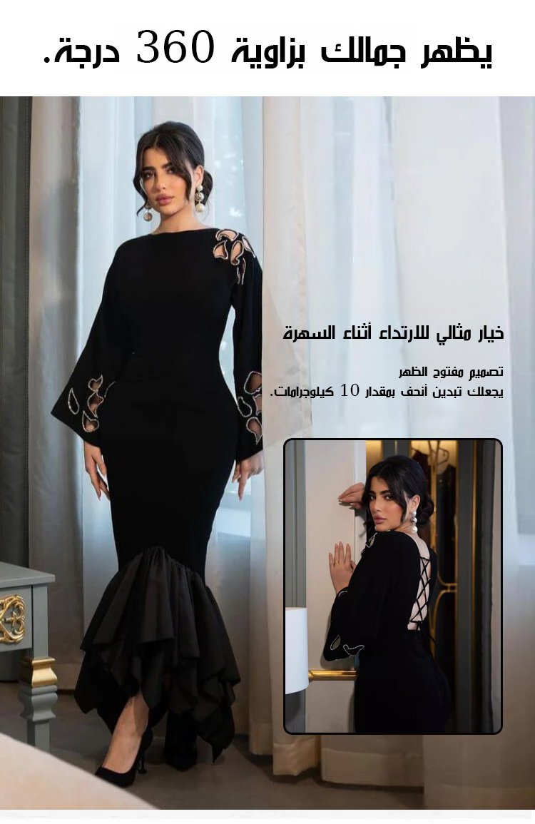 فستان طويل أنيق بقصة ذيل السمكة وأجزاء مفرغة جذابة وخلف مفتوح بأربطة رقيقة